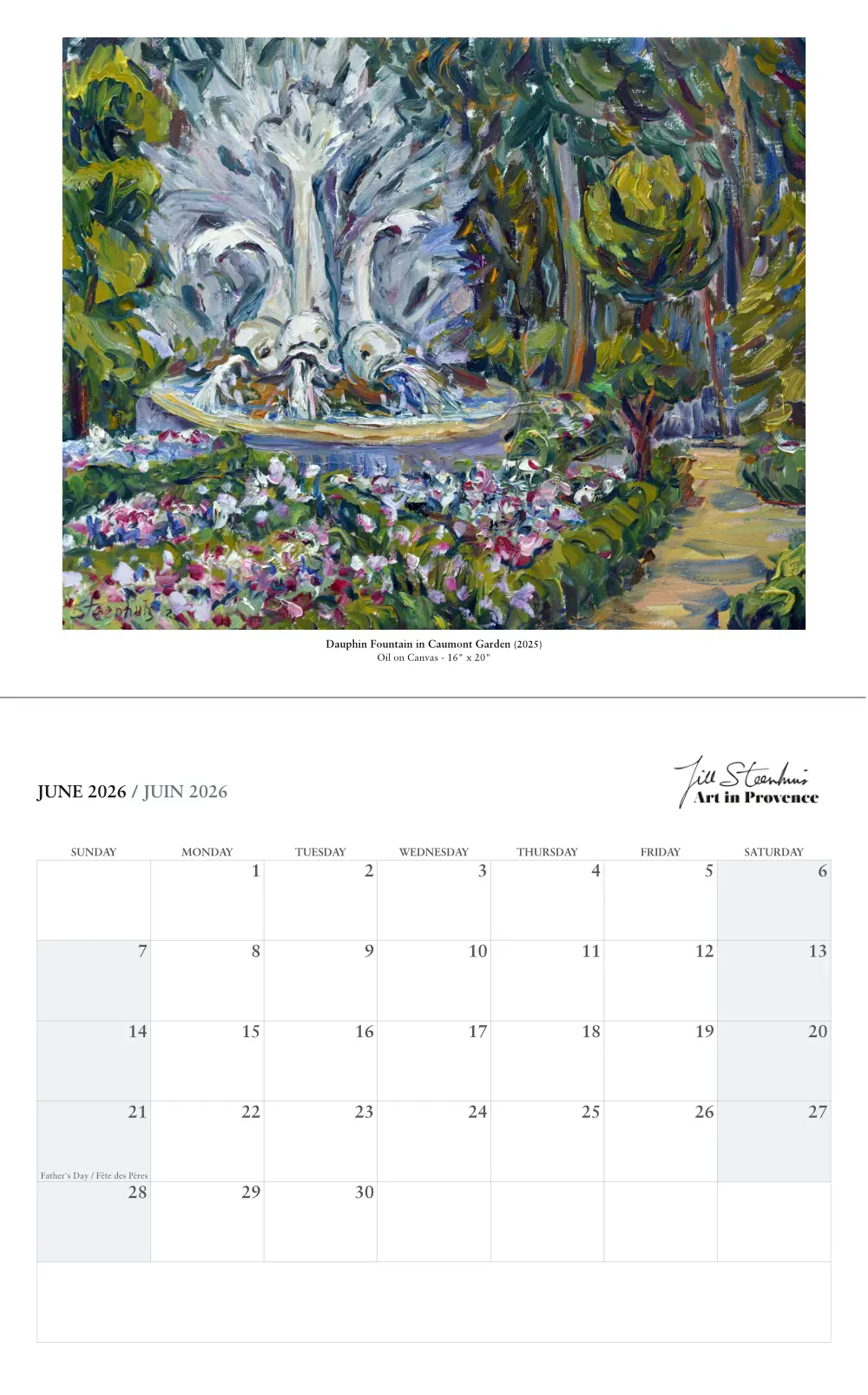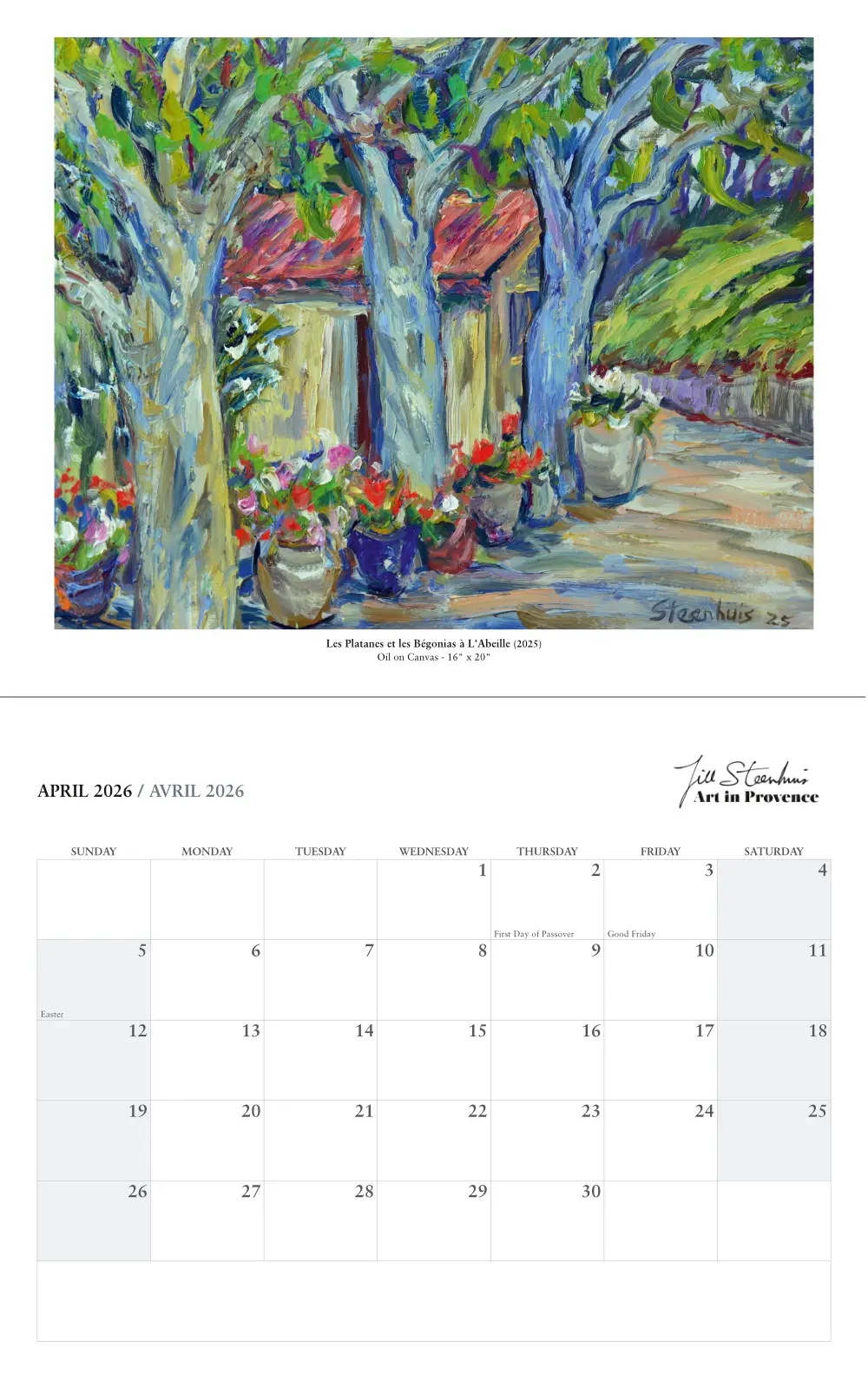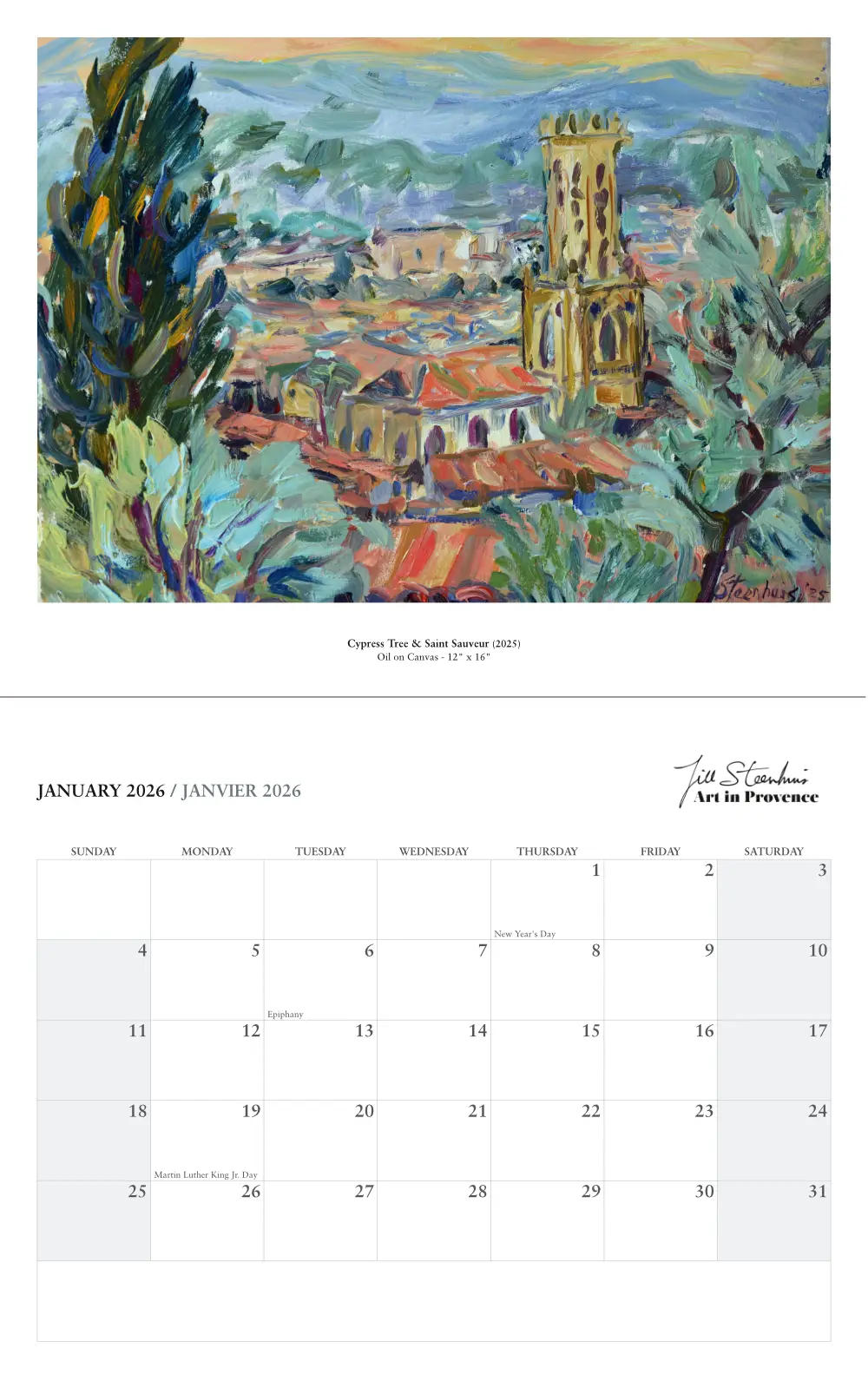 Voilà, the 2026 calendar is now available! A spiral-bound hanging calendar (18” x 11”) including 14 images of selected work from this current year. Experience a journey through the seasons and landscapes of Provence at the turn of each page.