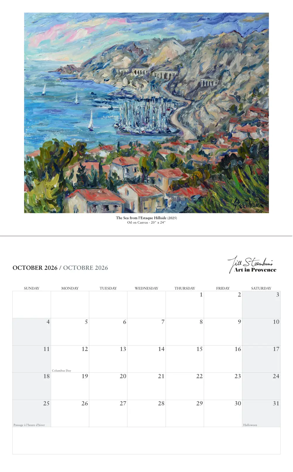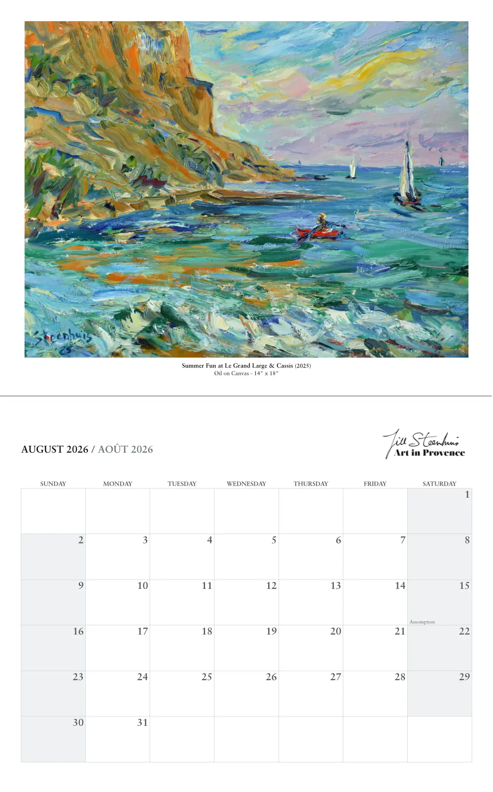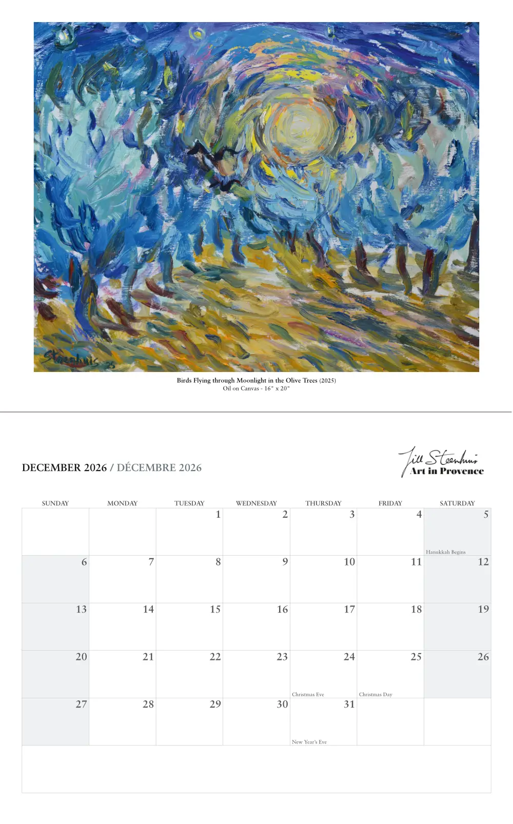 Voilà, the 2026 calendar is now available! A spiral-bound hanging calendar (18” x 11”) including 14 images of selected work from this current year. Experience a journey through the seasons and landscapes of Provence at the turn of each page.