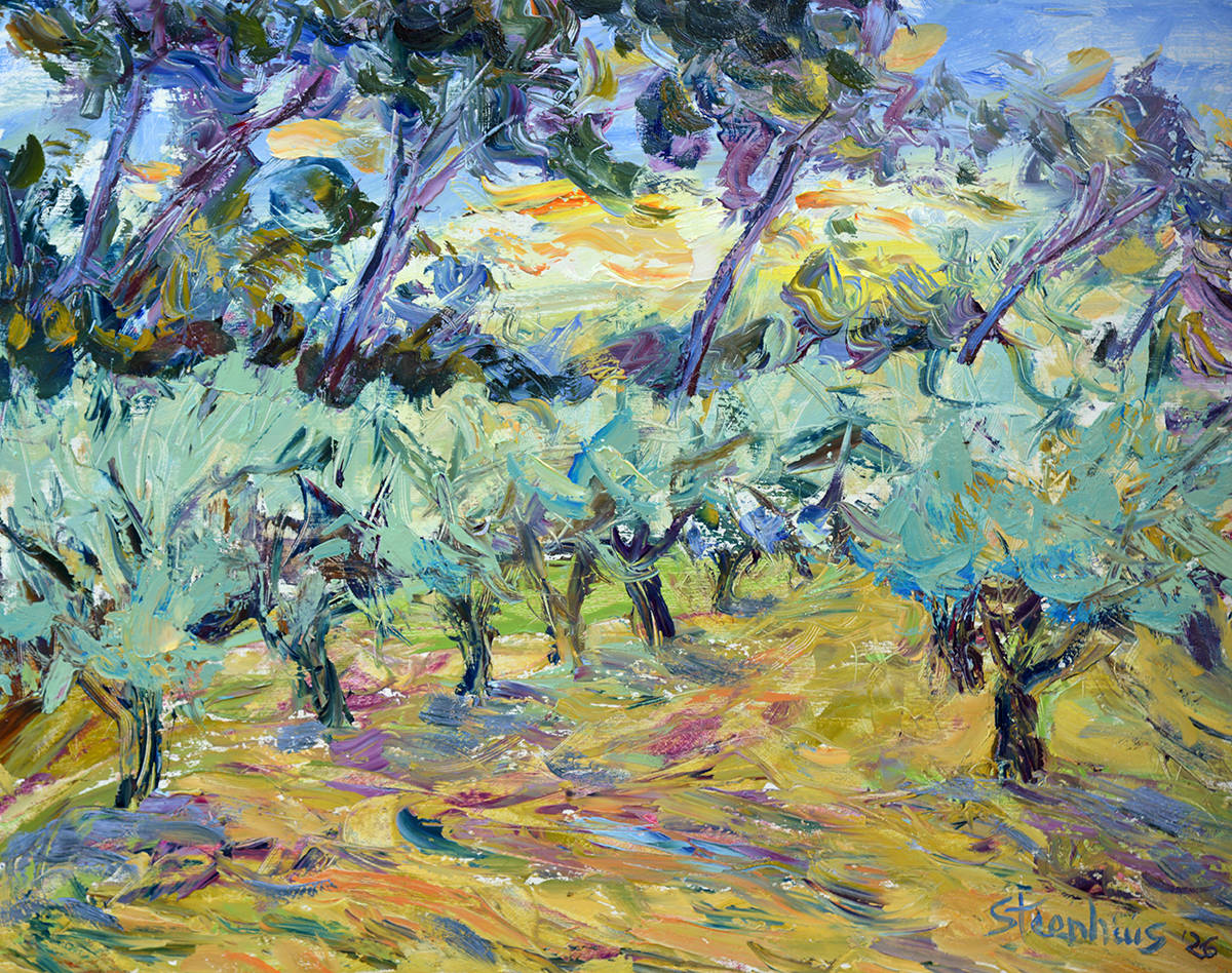 Olive Trees & Pines in Wind at Sunset